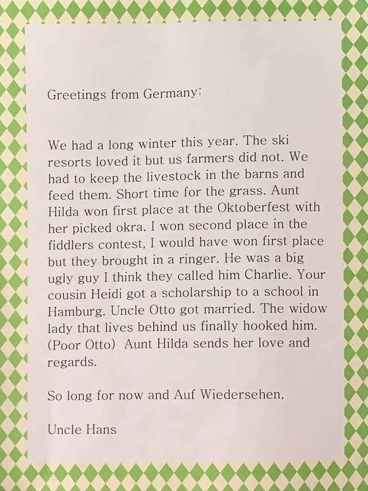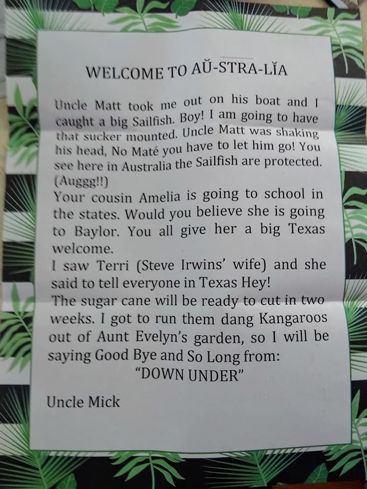 While browsing through my absolute favorite Facebook group, Weird second hand finds that just need to be shared, I came across a post by a woman named Sarah Padgett. She had posted about her grandfather who would send her family pictures and a letter each month. Each time dressed as a new character and the letter written as the new persona. Martin Padgett(age 91) is a mystery since Martin may not even be his real name, but he answers to it and the family has adopted it as his official name. I was able to speak with Sarah a bit about her grandpa.