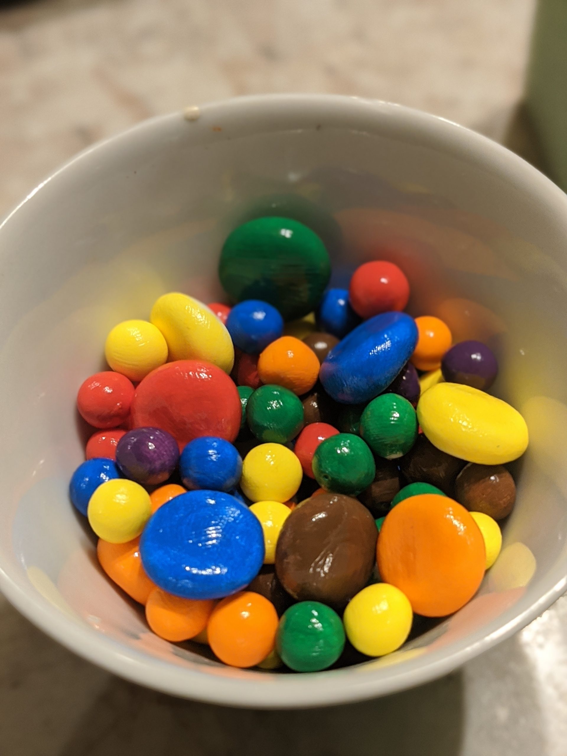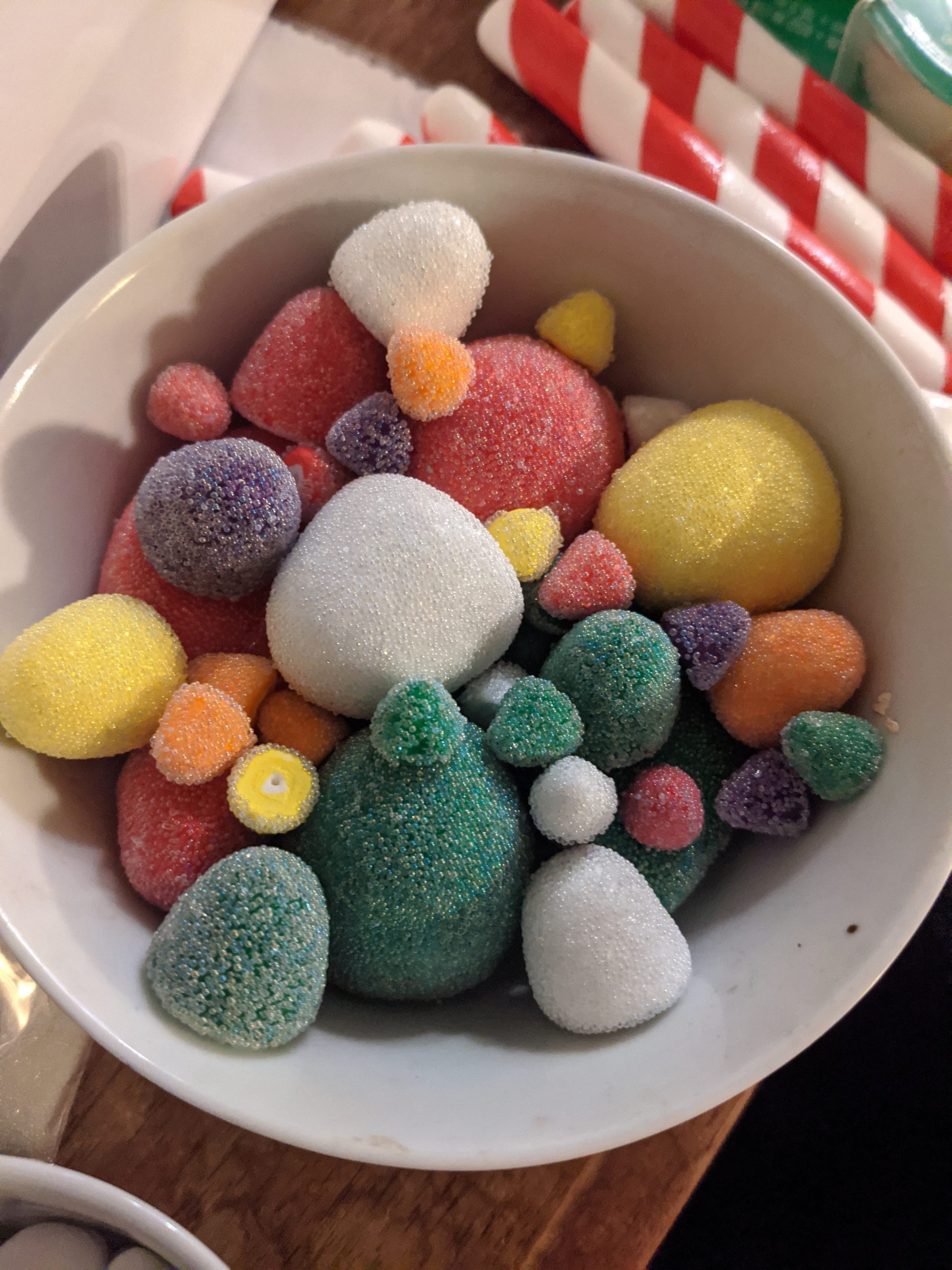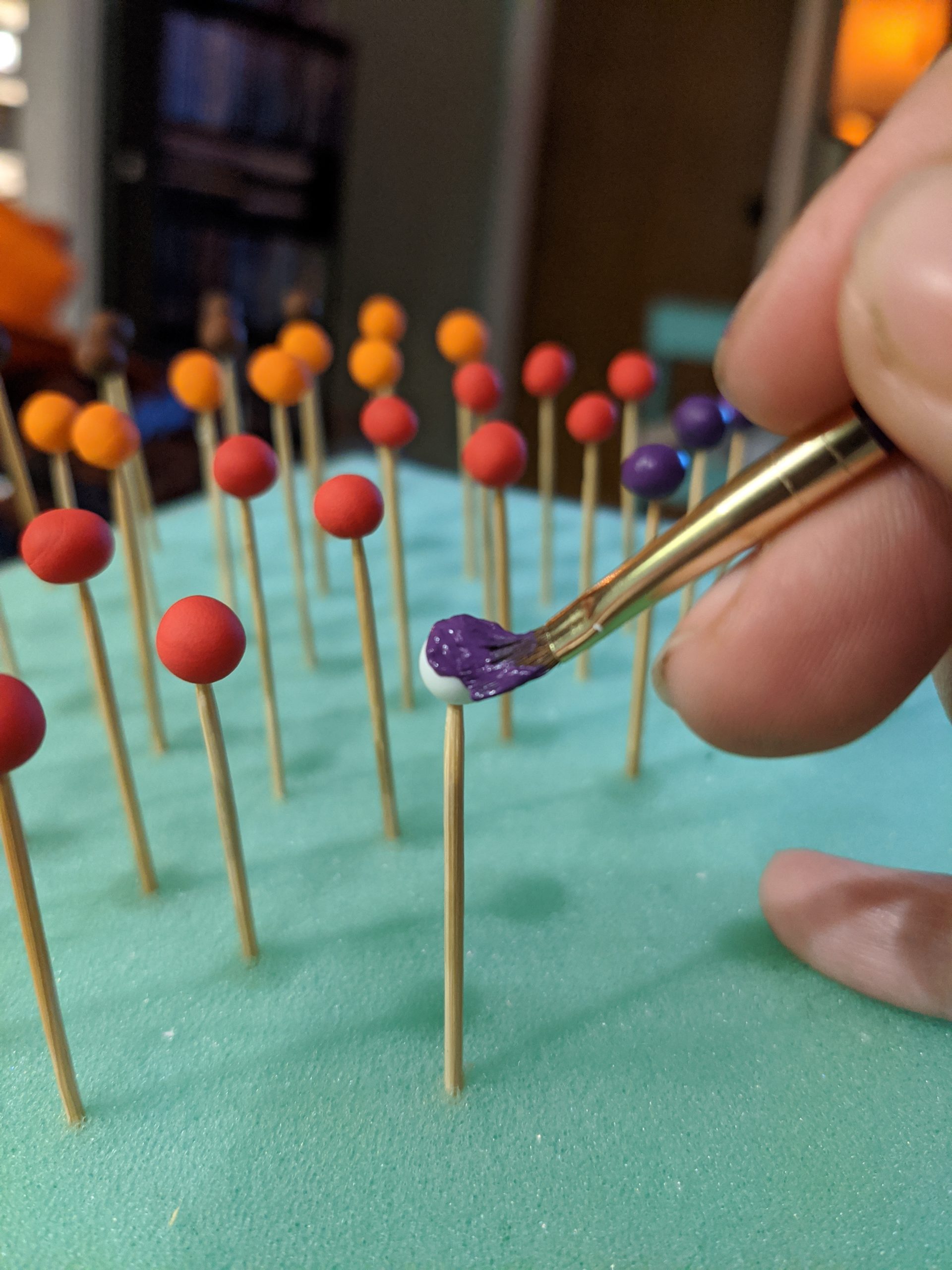 I then made a whole bunch of fake candy pieces out of foam clay and painted them. For the gumdrops, I painted a coat of Mod Podge onto them, and rolled them in tiny beads that look like fake sugar (also purchased from Etsy). For the rest, I applied a top coat of Mod Podge to give them a shiny finish.