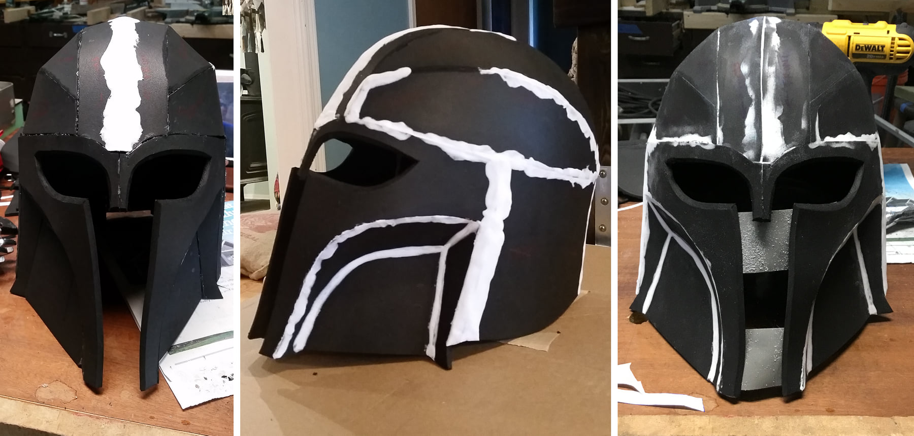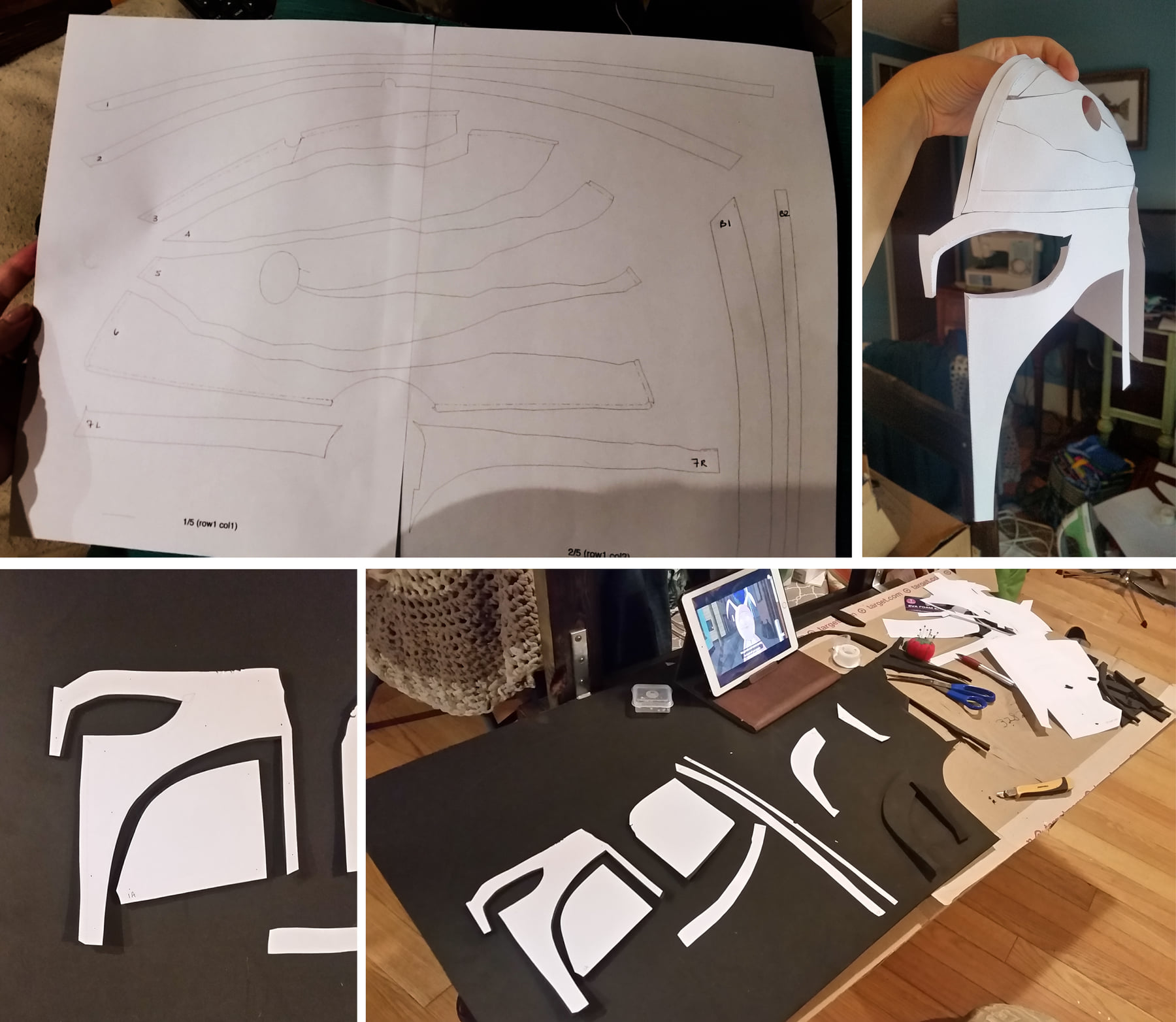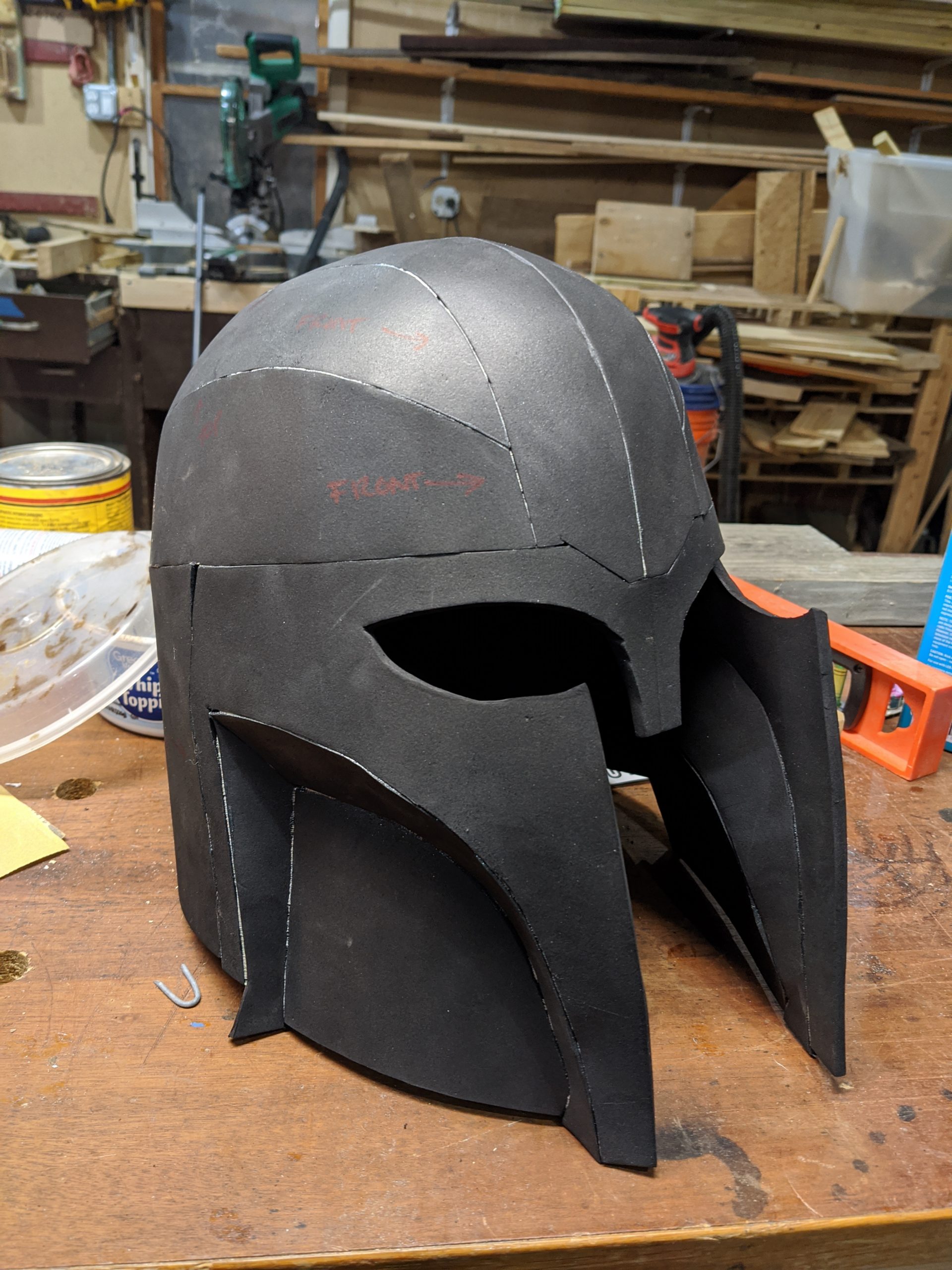 “So, to make this, I started by making the base of the helmet out of EVA foam, same as I’d done for my original Armorer helmet. I used a template that I’d purchased from PapercraftUniverse3D on Etsy.