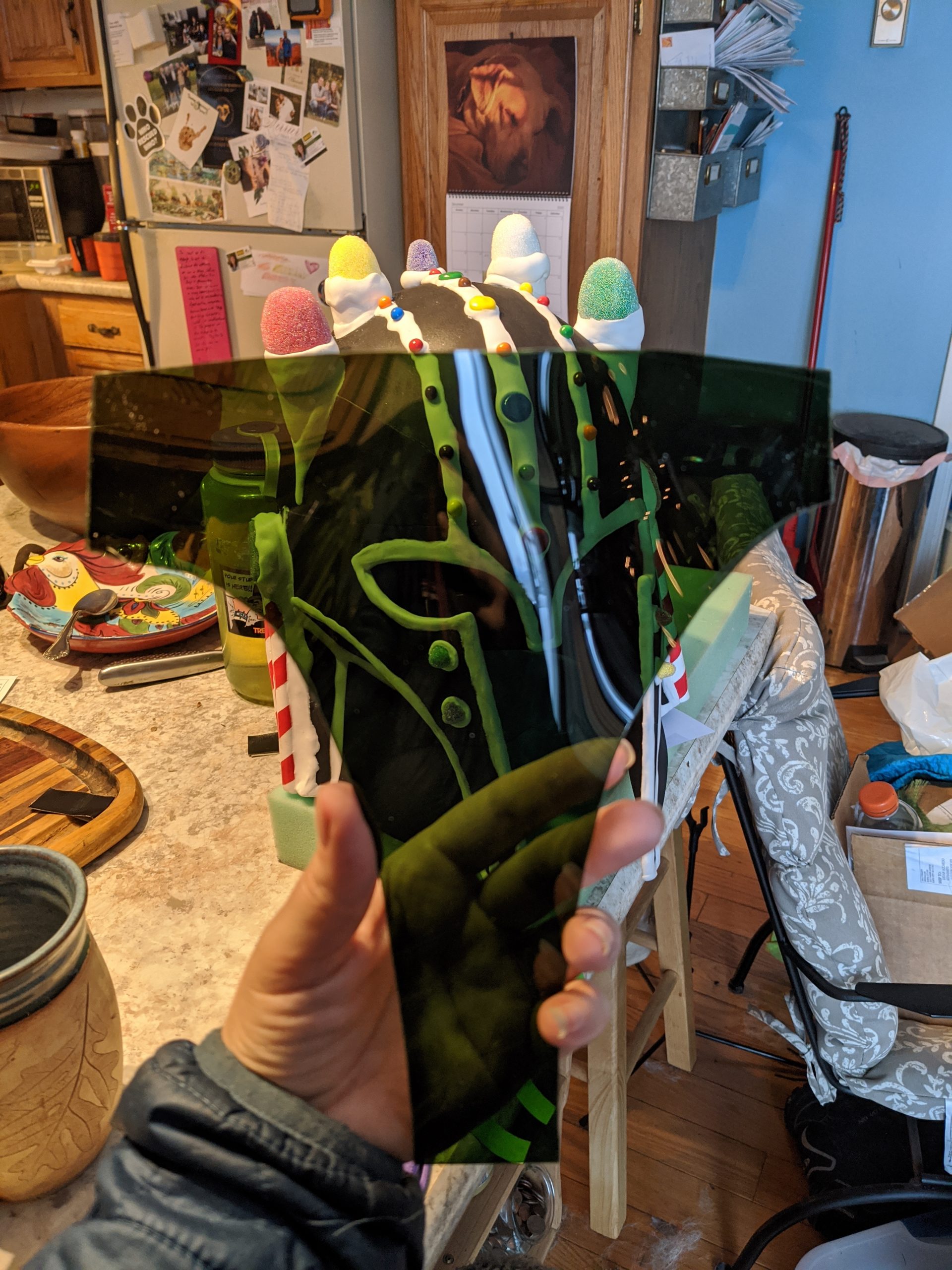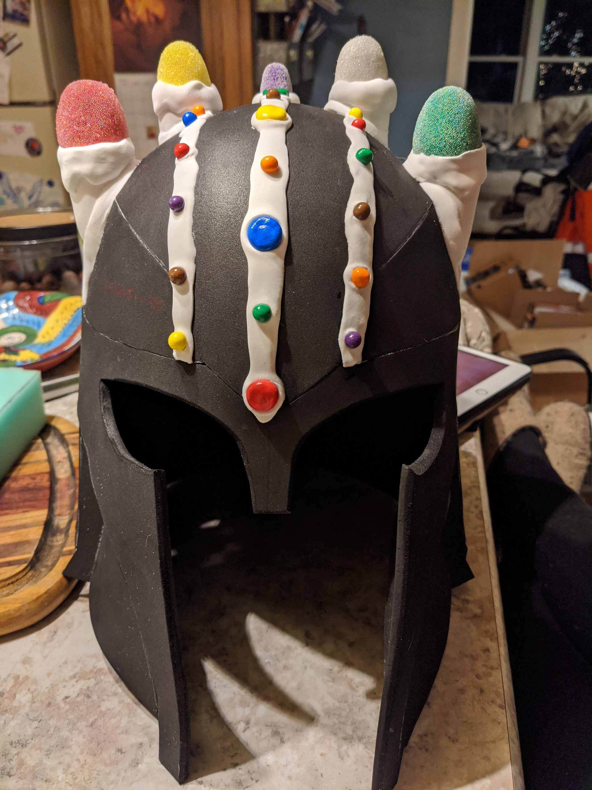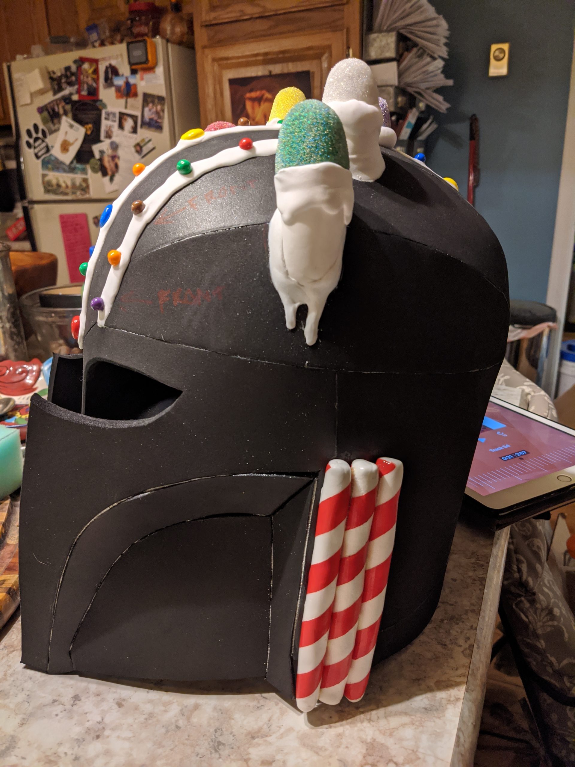 I then started applying the candy pieces to the helmet much like I would decorate a gingerbread house, using white foam clay as the “frosting.” The foam clay adheres to the EVA foam with water, so I attached everything before I painted it the gingerbread color. Once everything was attached, I painted the gingerbread color over the black foam.”